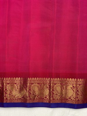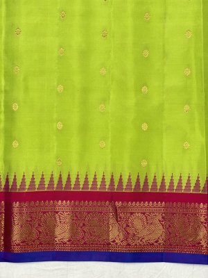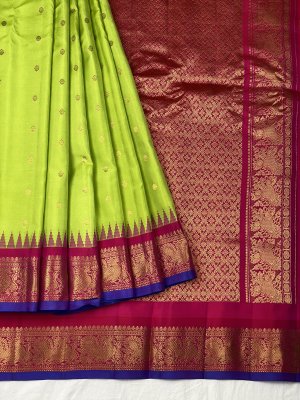 Embraced by the epitome of grace weaved in the perfection of Gadwal Silk Butta Lime Green Saree all over with gold zari floral buttas. This delightful weave is complemented by a gold zari medium pink border with paisleys in series and a blue edge. There is a contrast gold and silver zari brocade pallu with peacock motifs in series and florals. A contrast pink plain blouse with zari borders completes the look.