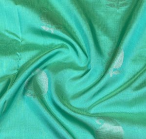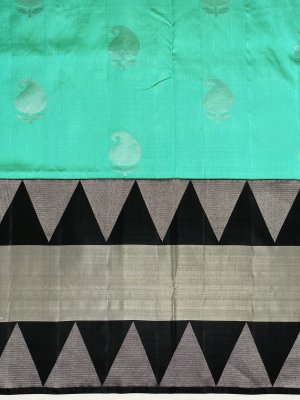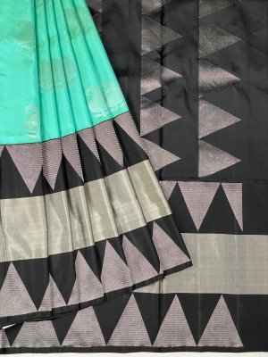 The silver zari plain buttas pattern all over, this soft silk pastel blue saree evokes magic and blandishment. A sumptuous silver zari small brocade border with silver zari with temple weaves and kaddi motifs. The pallu and the contrast-silver brocade with kaddi brocade of the saree create a mesmerizing effect, while the blouse is in contrast with zari borders.