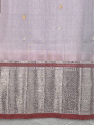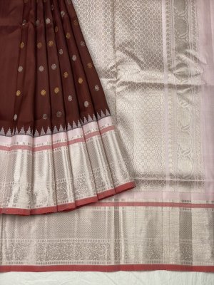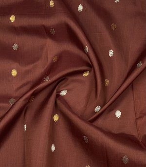 Don this gadwal silk butta cinnamon brown saree to enter the world of the retro era. Beautiful gold-silver zari floral butta are nestled into a baby pink border with silver zari brocade in addition to flowery vines and are flanked by pinkish selvedge for a rich appeal. The drape is made into a magnificent narrative by the blue pallu with brocade convoyed by floral vines. The outfit is finished off with a basic pink zari bordered blouse.
