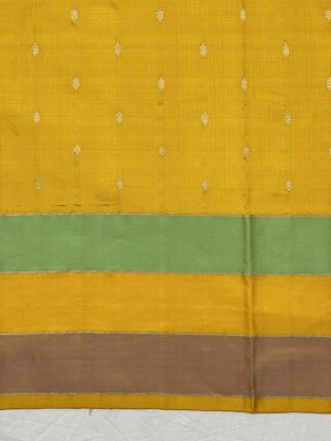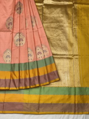 An appealing gold zari floral meena butta is beautifully woven into a banarasi silk butta light peach saree. It comes medium silk multi colored border with floral vines enhances the spellbinding charm of the weave adding beauty to it. Combined with the contrast yellow brocade pallu, the gold zari brocade border buttas blouse dazzles and pleases.