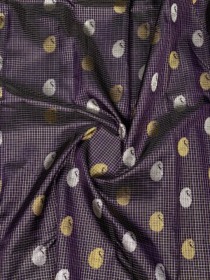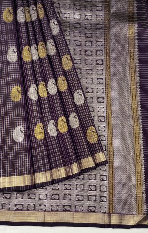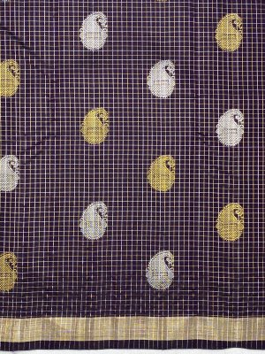 Radiant in its elegance, the kanchipuram silk checks and butta dark blue saree enchants with silver zari checks and floral mango butta all over. The spellbinding charm of the weave is further enhanced with a small self kaddi border gives a charming look to this saree. The self silver zari brocade pallu checks features peacock motifs in series. The ensemble is completed with a plain blouse with zari borders, adding a touch of fabulousness to the outfit.