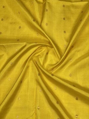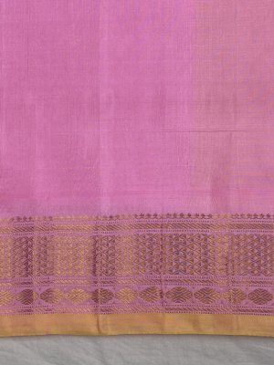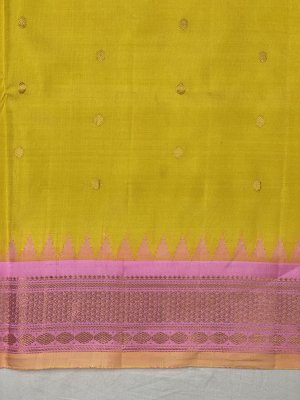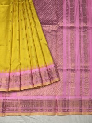Fusion of elegance and decorum is this Gadwal Silk Brocade Yellow Saree that is graced with gold zari brocade all over the body. The contrast gold zari brocade pink medium border. encircles the saree whereas contrast-gold zari brocade pallu adds a rich finish along with a contrast pink plain blouse with zari borders making it all a complete piece of glory.
