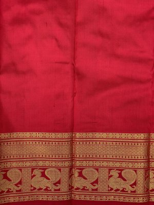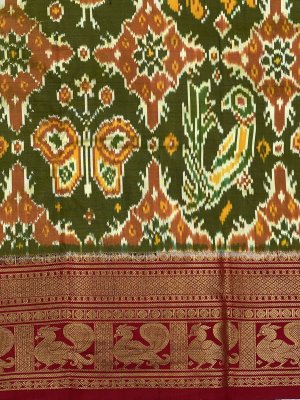 Exuding a warm glow to complement your beautiful radiance, this green pochampally silk Ikkat saree gleams with zari and with butterfly and parrots with ikkat motifs. The charming weave is given a vivacious edge with a contrast zari red kanchi border. The resplendent red pallu charms with traditionall peacocks and kaddi brocade. The saree comes with a plain red blouse with zari borders.