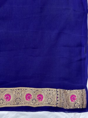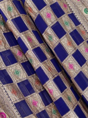Revel in the ethereal beauty of gorgeous elegance in this banarasi georgette navy blue saree. The georgette edit is flaunted with floral checks and kaddi florals embraced into self zari inspired border featuring meena floral motifs. The self brocade inspired pallu with gorgeous floral motif series convoyed with floral vines adds charm to the drapery. The saree comes with a blue plain bordered blouse.