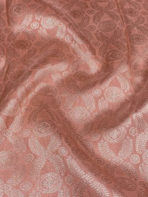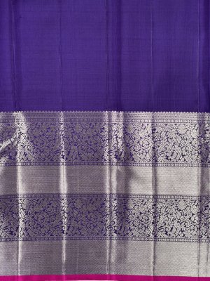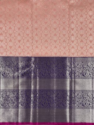 Decked in a dreamy peach tone, this kanchipuram silk floral leaf's, and butta saree is sure to stun the gazes. Manifested in silver zari sited with floral chakra motifs in silver zari over the elegant peach overlay with contrast rettai pattu blue border flaunting silver zari floral brocade series is echoing magical artistry. The contrasting blue pallu with floral brocade center with wheat kernel motif series on either end is delicately feminine. The ensemble is paired up with a contrasting blue bordered blouse.