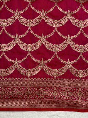 Demanding attention at first glance, this Banarasi Silk Kadwa moon Jaal Pink Saree makes a perfect party ensemble. The pretty pink magnificence is embellished with gold zari floral kadwa jaal that is tucked across a self-border displaying floral vines adjacent to the brocade. The self-pallu, with intricate brocade convoyed with floral vines on either end, is stunning in its minimalistic splendor. The saree comes with a self-plain blouse.
