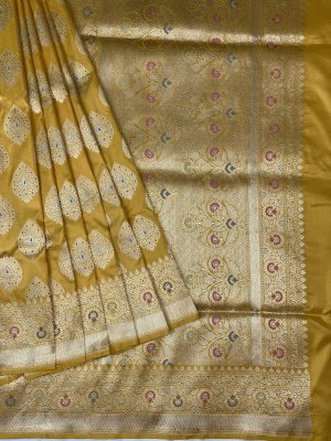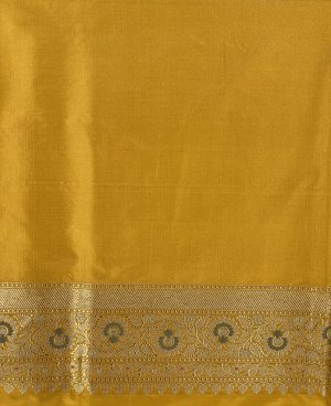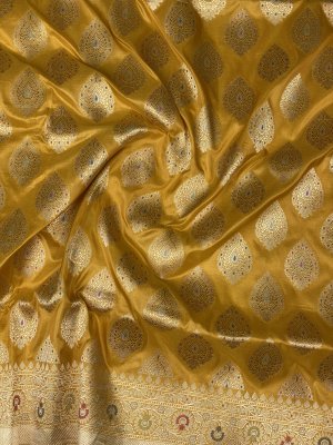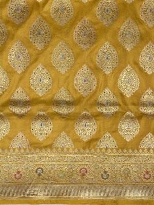 Illuminate your wardrobe with our radiant golden yellow Banarasi saree adorned with exquisite kalga and multicolored ball accents. The border features a captivating floral print in shades of golden beige and other vibrant colors, representing a symphony of elegance and sophistication. This saree is a timeless masterpiece, perfect for those who cherish traditional craftsmanship and contemporary design.
