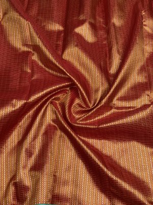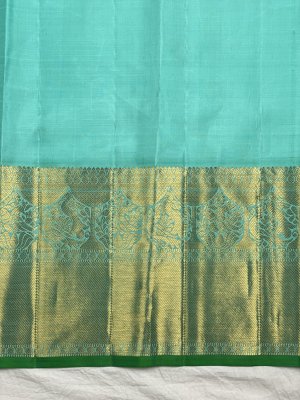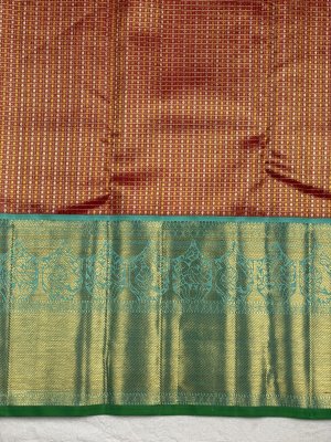This exquisite Kanchipuram Checks And Butta Red Saree is adorned with gold zari checks and buttas throughout. It features a contrast gold zari blue border adorned with peacock motifs in florals. An opposite pallu with zari brocade motifs in florals contrasts with a plain blue blouse with zari borders.