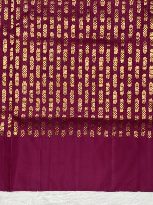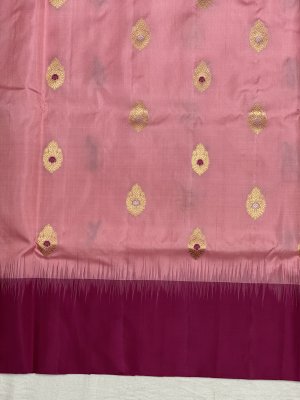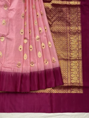 Divine and enchanting, this Soft Silk Butta Pink Saree features gold zari floral butta with red meena all over, accentuated by a contrast gold zari medium purple plain silk border and the contrast gold zari kaddi pallu with floral vines and the contrast brocade buttas blouse with zari borders complete this ensemble.