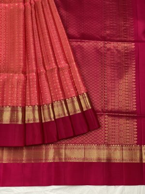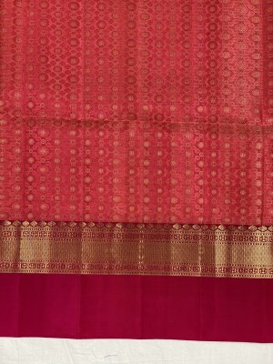 Crafted beautifully, this Soft Silk Thread weaving Butta pink Saree features gold zari floral butta all over the body, enhanced by a De-contrast gold zari small silk border. The contrast gold zari kaddi pallu with kaddi motifs in kaddi dazzles and pleases, while the self plain dark pink blouse with zari borders makes it unforgettable.