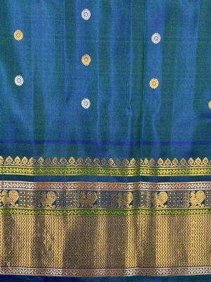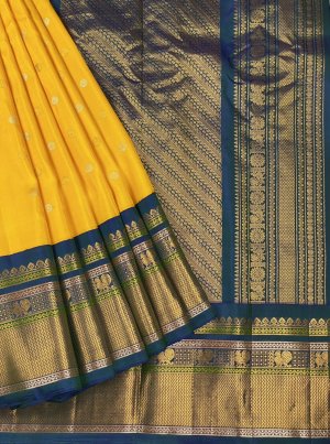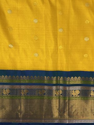 Adorn yourself in timeless elegance with our yellow Gadwal silk saree featuring intricate gold flower butta motifs. The saree is beautifully complemented by a navy blue, green, and gold border, adorned with majestic peacock motifs. Crafted with exquisite craftsmanship, this saree is a perfect blend of tradition and sophistication, ideal for weddings, festivities, or special occasions.